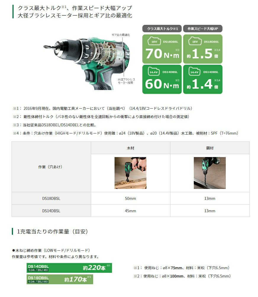 ■クラス最大トルク※1、作業スピード大幅アップ 大径ブラシレスモーター採用とギア比の最適化 ※1 2016年9月現在。