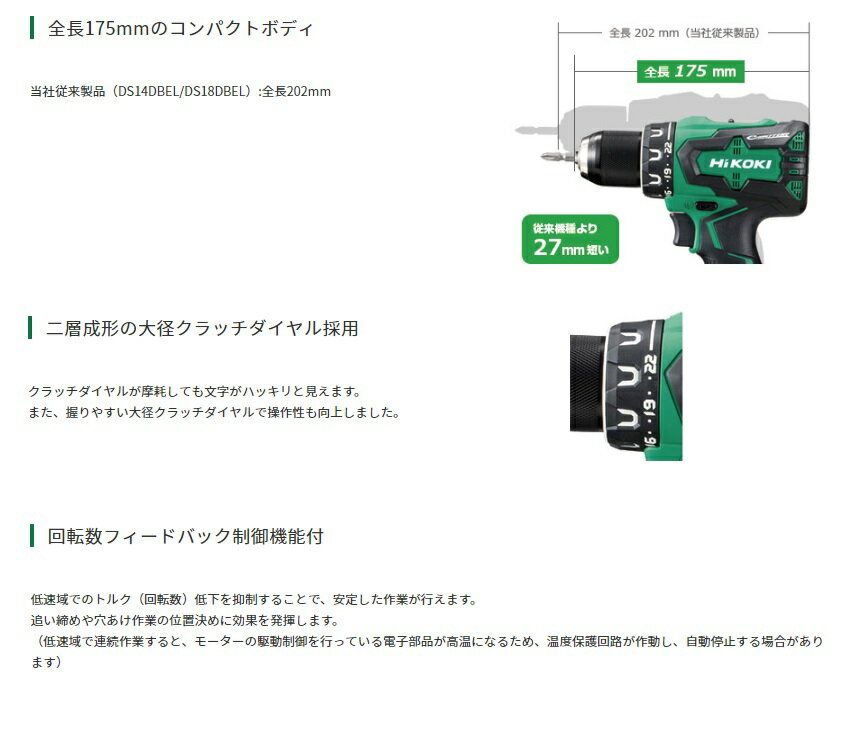 ・エンジン発電機対応 ・低温充電対応(-10℃まで)コードレスドライバドリル DS18DBSL ※販売はタイトルの商品です。