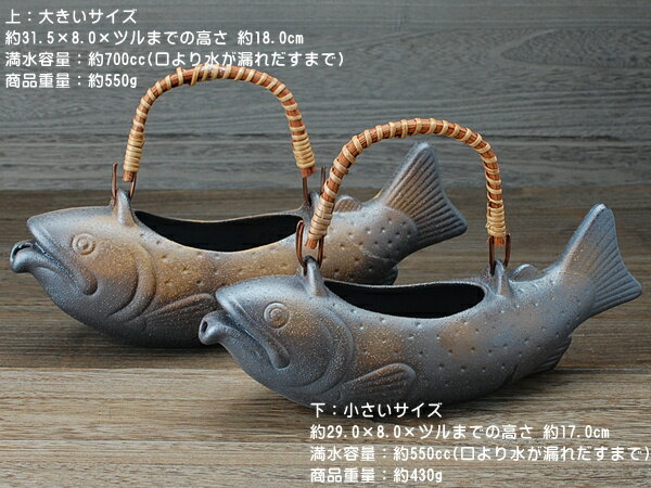 直火での使用はできません こちらは小さいサイズのセット販売ページです ↓ 大きいサイズへはこちらへ ↓ 〜オリベ〜 魚の口元が注ぎ口 になっています 少しとぼけた様な顔が キュートです 魚を入れる部分のサイズは 約9.5×5.5cmです 大きいサイズの骨酒徳利 より1.0cm程小さいサイズです 〜荒黒〜 ざらざらとした手触りの 商品です より民芸調の雰囲気 花器に使われる方もみえます 大きいサイズ: 約31.5×8.0×ツルまでの高さ18.0cm 満水容量:約700cc 商品重量:約550g 小さいサイズ: 約29.0×8.0×ツルまでの高さ17.0cm 満水容量:約550cc 商品重量:約430g ↓ 小さいサイズの商品へは ↓ ↓ 大きいサイズの商品へは ↓