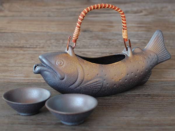 直火での使用はできません岩魚 骨酒用セット(酒器+盃×2ヶ) 岩魚などの渓魚をじっくり炭火などの遠赤外線で カリカリになるまで焼き、酒器(魚型徳利)に入れます。