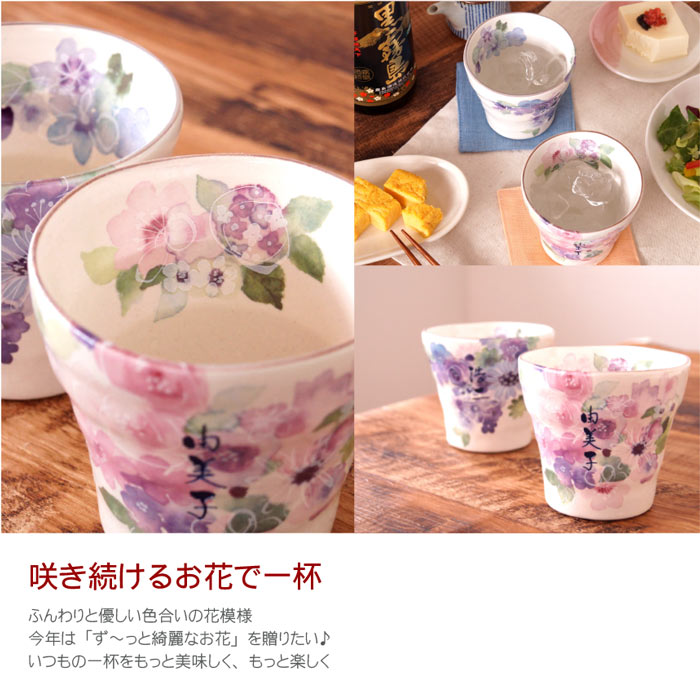 ふわっと優しい花柄の美濃焼 花柄 焼酎カップ 夫婦セットは ありがとうの気持ちを込めて、お父さん、お母さんへ母の日・父の日の贈り物や おじいちゃん、おばあちゃんへ敬老の日のギフトに◎ 名入れカップは長寿のお祝い、還暦祝い、結婚祝いなどの記念日ギフト 誕生日のお祝いのプレゼントにも喜ばれます◎ 長寿祝い のプレゼントに 還暦祝い 古希祝い 古稀祝い 喜寿祝い 傘寿祝い 米寿祝い 卒寿祝い 新居祝い 白寿祝い 百寿祝い 長寿の 記念品 や 銀婚式 真珠婚式 珊瑚婚式 翡翠婚式 ルビ−婚式 サファイア婚式 金婚式 エメラルド婚式 ダイヤモンド婚式 プラチナ婚式 両親 祖父母 の 結婚記念日 結婚式 両親 贈呈品 定年退職 送別品 退職祝い 誕生日プレゼント 母の日 父の日 敬老の日 の贈り物に 大切なお祝いは、長寿祝い専門店[ふくふく]で 世界にひとつの特別なプレゼント♪
